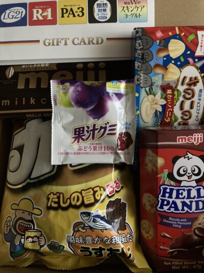 ギフトカード・カールうすあじ・ハローパンダ・きのこの山 味わいバニラ・果汁グミぶどう