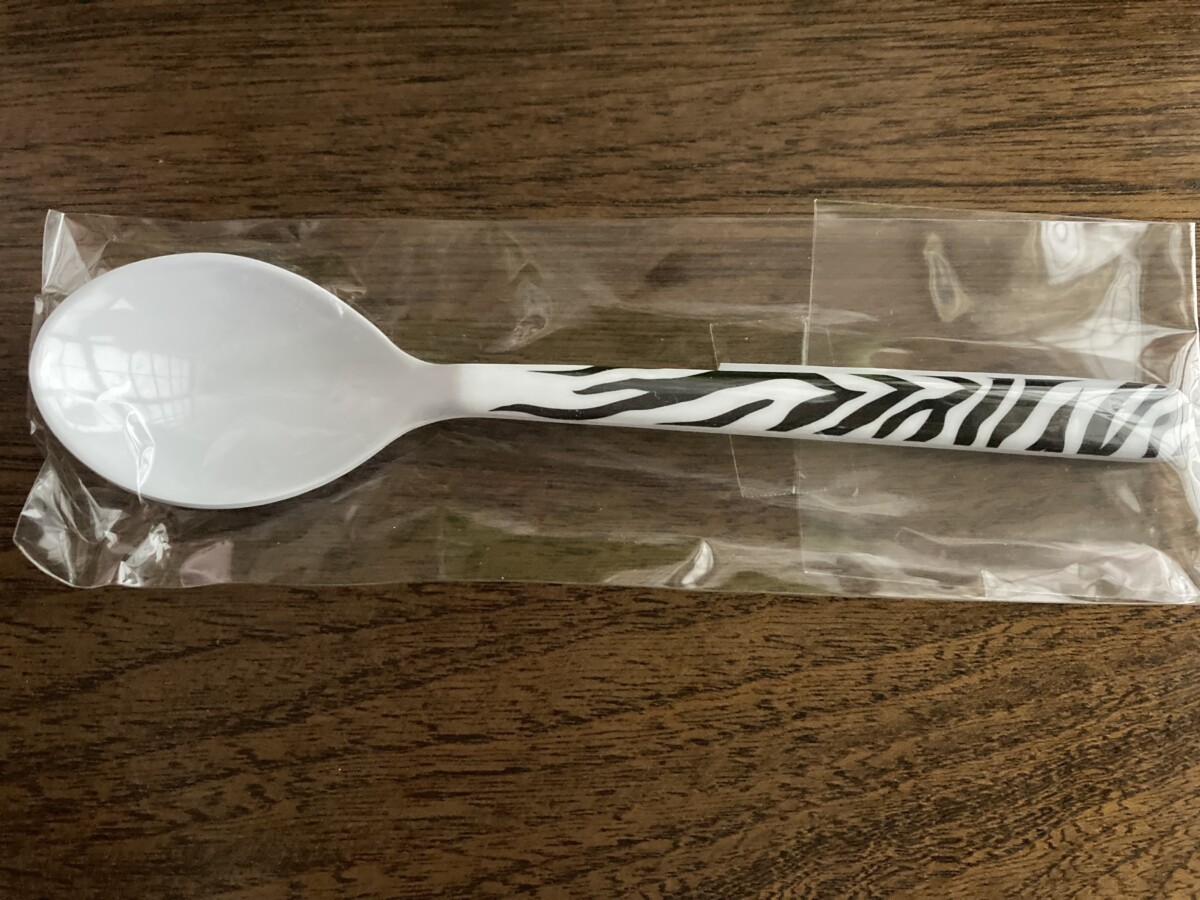 プレゼントはアニマル柄のスプーンとフォーク数種類から選べました。(黄緑色のクリアファイルは品切れでした。)シマウマ柄のスプーンを選びました。他にはヒョウ柄などがあってピンク・黄色・茶色がありましたが、食欲が湧く色がいいかと思い白にしました。