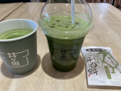 調理場がガラス張りになっていて作る所が見えます。てっきりドリンクサーバーから簡単に提供されるのだと思っていたら、店員さんが1人分ずつ茶筅で抹茶を点てて容器に移していました。